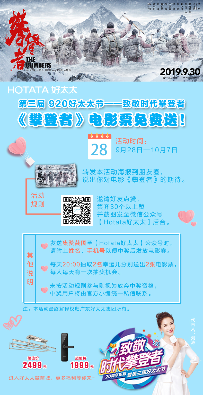 微信关注官方公众号【Hotata好太太】,回复“电影票”,即获得电影《攀登者》送票攻略。